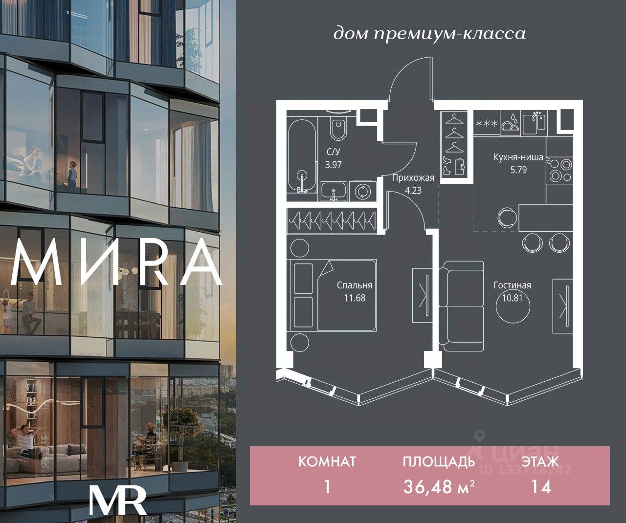 Продаётся 1-комнатная квартира общей площадью 36.48 м² без отделки в доме премиум-класса МИRА на 14-м этаже 24 этажного дома. Квартира расположена в корпусе 3.