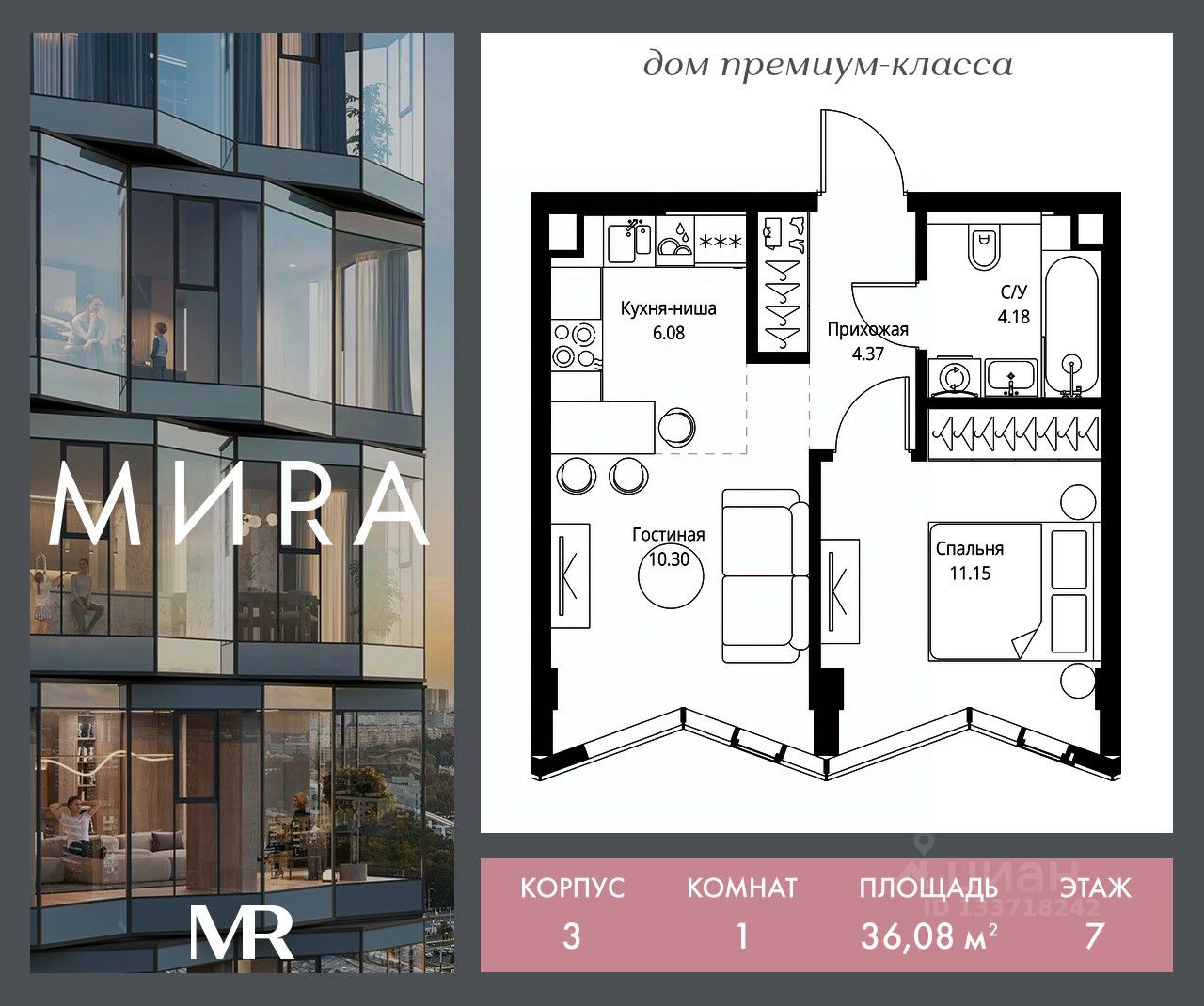 Продаётся 1-к квартира общей площадью 36.08 м²без отделки в доме премиум-класса МИRА на 7-м этаже 24 этажного дома. Квартира расположена в корпусе 3.