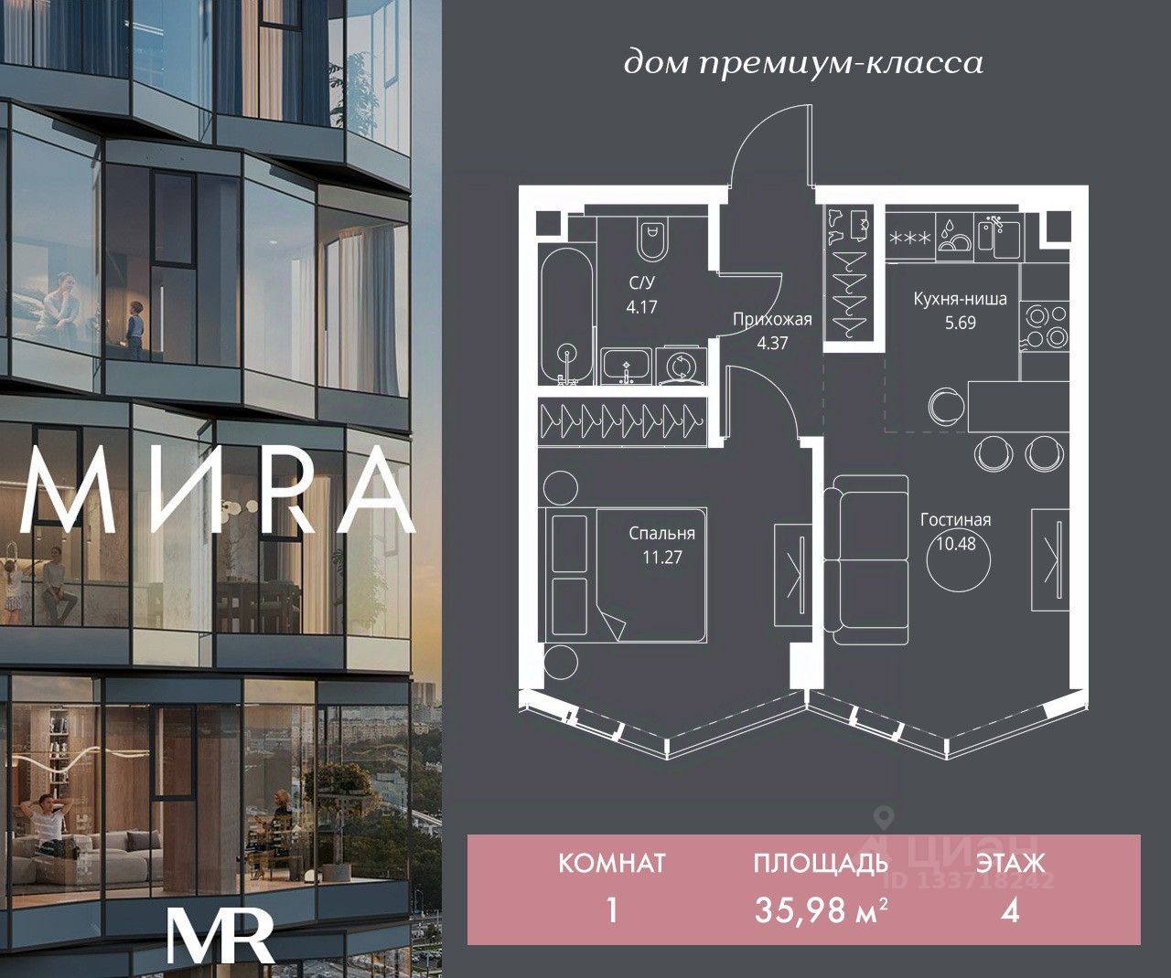 Продаётся 1-комнатная квартира общей площадью 35.98 м² без отделки в доме премиум-класса МИRА на 4-м этаже 24 этажного дома. Квартира расположена в корпусе 3.