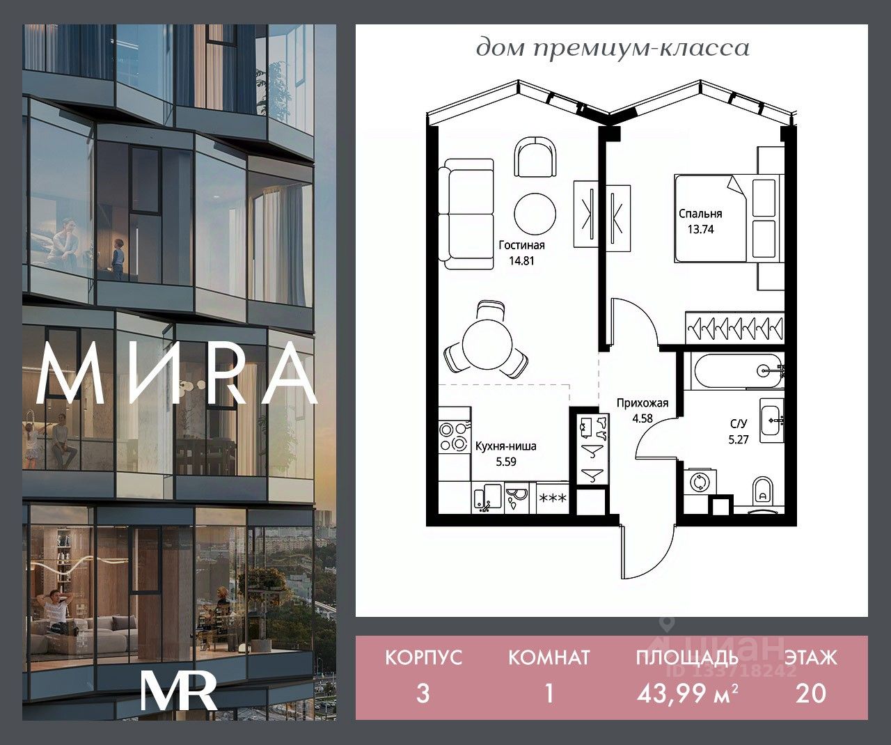 Продаётся 1-к квартира общей площадью 43.99 м²без отделки в доме премиум-класса МИRА на 20-м этаже 24 этажного дома. Квартира расположена в корпусе 3.