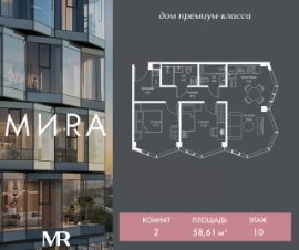 Продаётся 2-комнатная квартира общей площадью 58.61 м² без отделки в доме премиум-класса МИRА на 10-м этаже 24 этажного дома. Квартира расположена в корпусе 3.