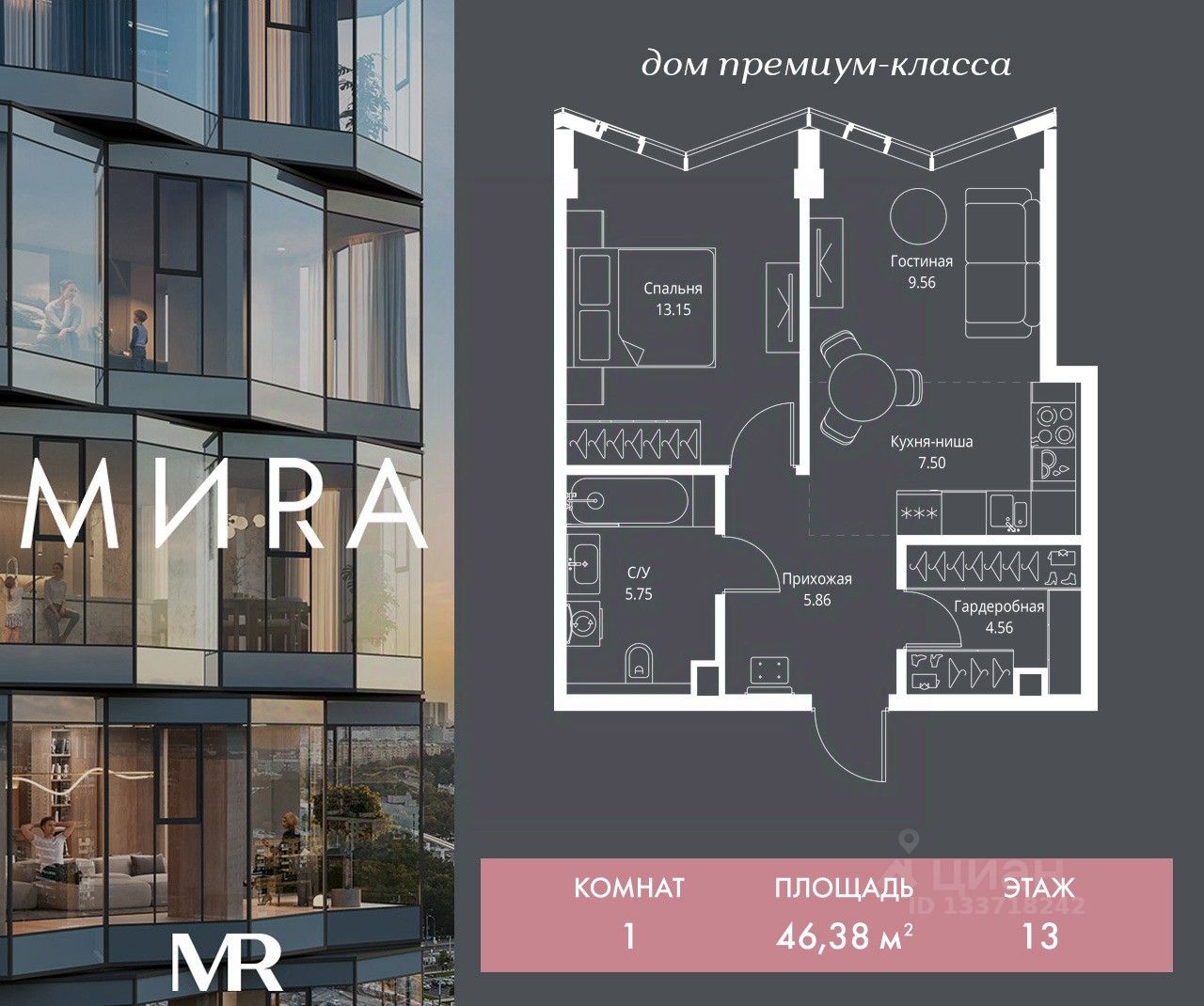 Продаётся 1-комнатная квартира общей площадью 46.38 м² без отделки в доме премиум-класса МИRА на 13-м этаже 24 этажного дома. Квартира расположена в корпусе 3.