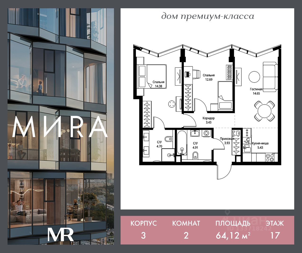 Продаётся 2-к квартира общей площадью 64.12 м²без отделки в доме премиум-класса МИRА на 17-м этаже 24 этажного дома. Квартира расположена в корпусе 3.