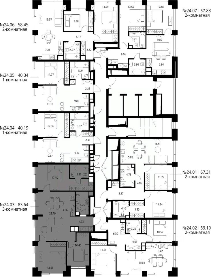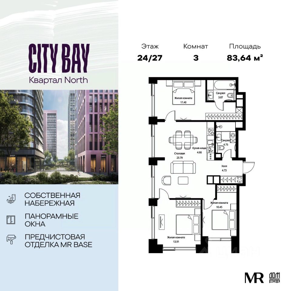 Продаётся 3-к квартира общей площадью 83.64 м² с предчистовой отделкой в ЖК City Вау, квартале North, на 24-м этаже 27 этажного дома.