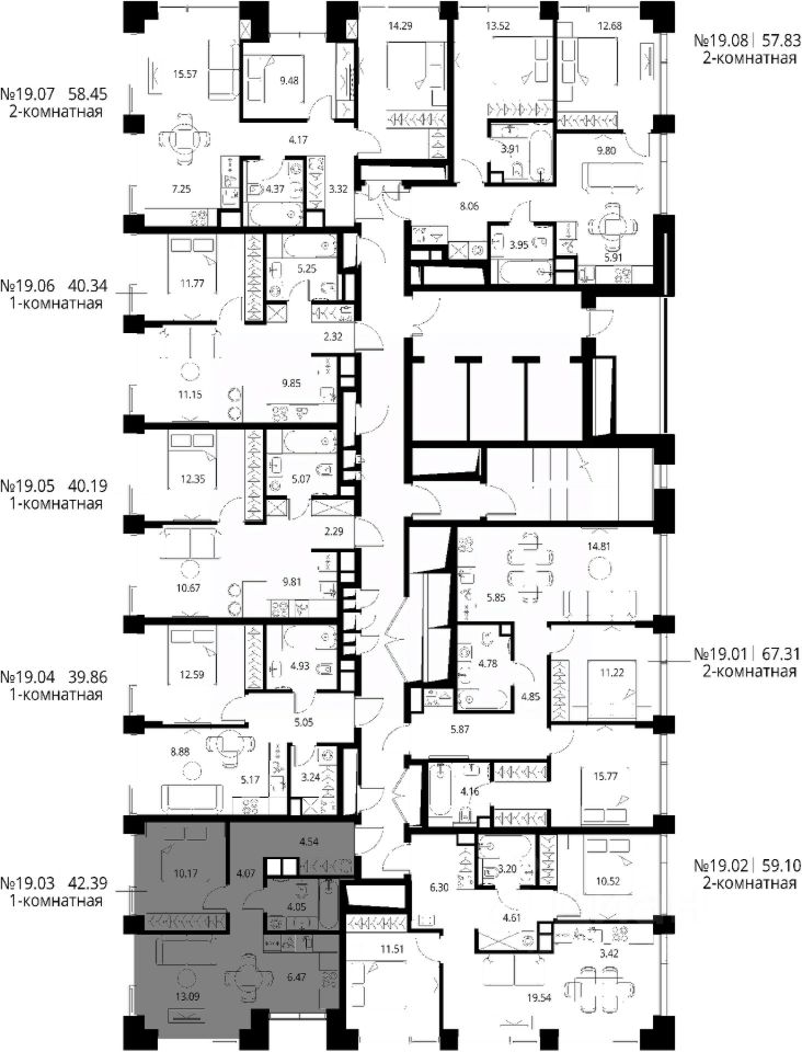 Продаётся 1-комнатная квартира общей площадью 42.39 м² с предчистовой отделкой в ЖК Сити Бэй, квартале Норс, на 19-м этаже 27 этажного дома.