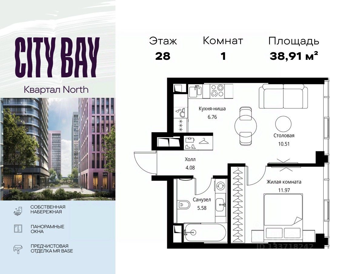 Продаётся 1-комнатная квартира общей площадью 38.91 м² с предчистовой отделкой в ЖК City Вау, квартале North, на 28-м этаже 49 этажного дома.