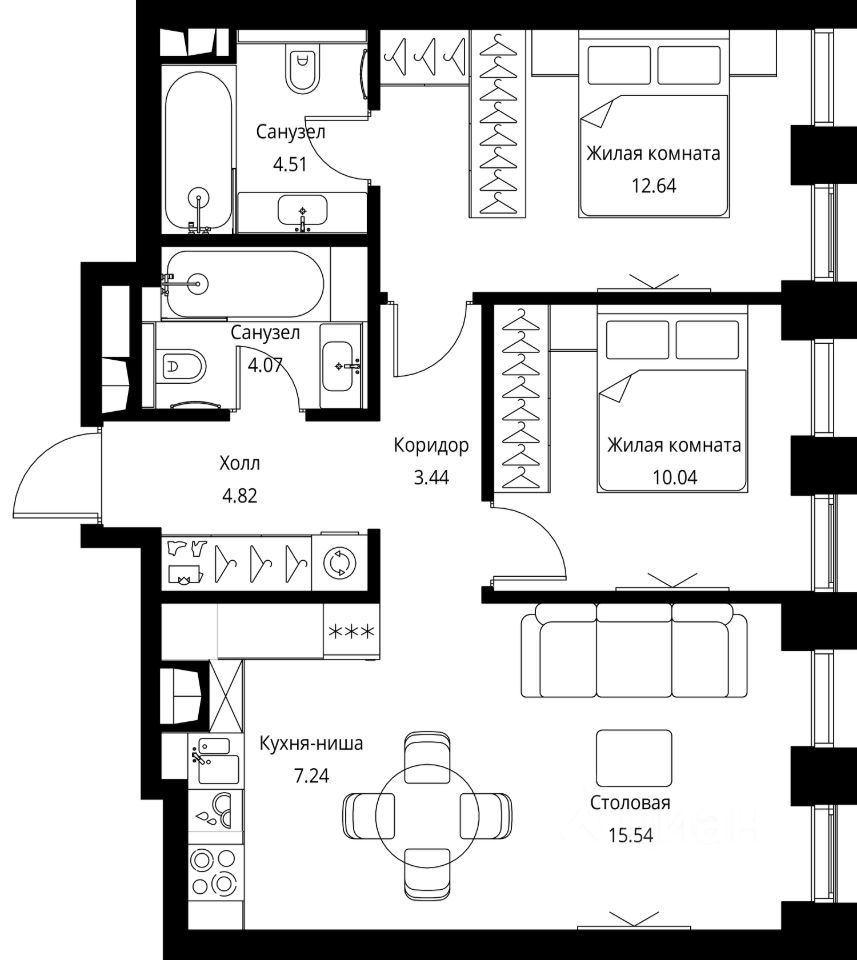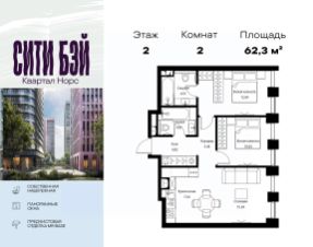 Продаётся 2-комнатная квартира общей площадью 62.30 м² с предчистовой отделкой в ЖК Сити Бэй, квартале Норс, на 2-м этаже 27 этажного дома.