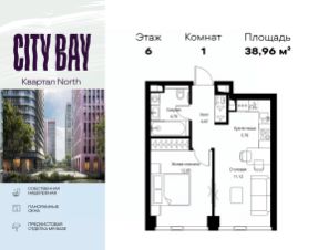 Продаётся 1-комнатная квартира общей площадью 38.96 м² с предчистовой отделкой в ЖК City Вау, квартале North, на 6-м этаже 48 этажного дома.