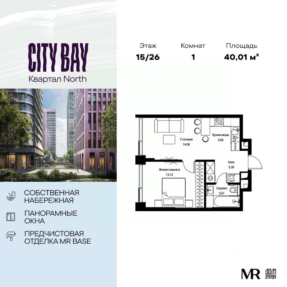 Продаётся 1-к квартира общей площадью 40.01 м² с предчистовой отделкой в ЖК City Вау, квартале North, на 15-м этаже 26 этажного дома.