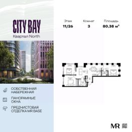 Продаётся 3-к квартира общей площадью 80.38 м² с предчистовой отделкой в ЖК City Вау, квартале North, на 11-м этаже 26 этажного дома.