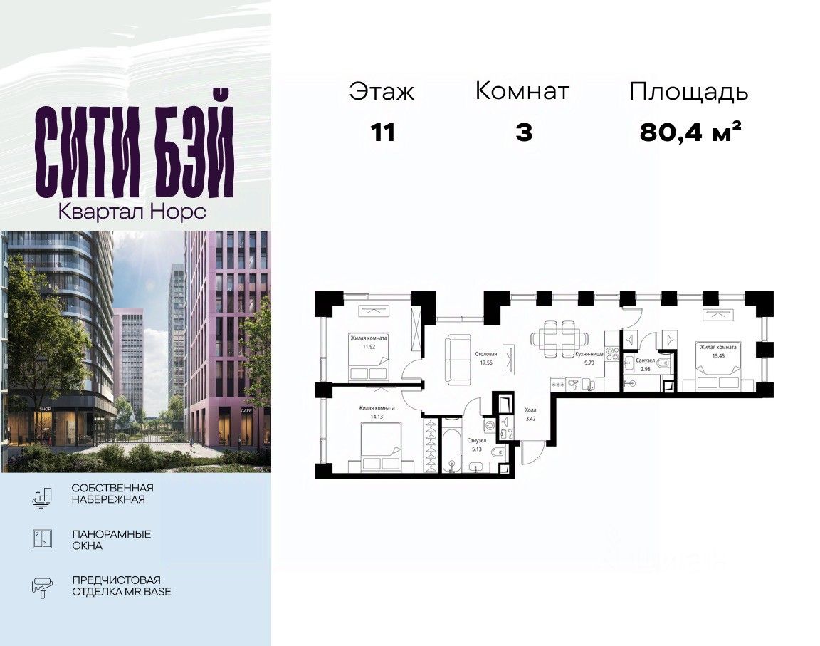 Продаётся 3-комнатная квартира общей площадью 80.38 м² с предчистовой отделкой в ЖК Сити Бэй, квартале Норс, на 11-м этаже 26 этажного дома.