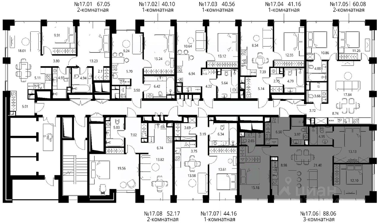 Продаётся 3-комнатная квартира общей площадью 88.06 м² с предчистовой отделкой в ЖК Сити Бэй, квартале Норс, на 17-м этаже 27 этажного дома.