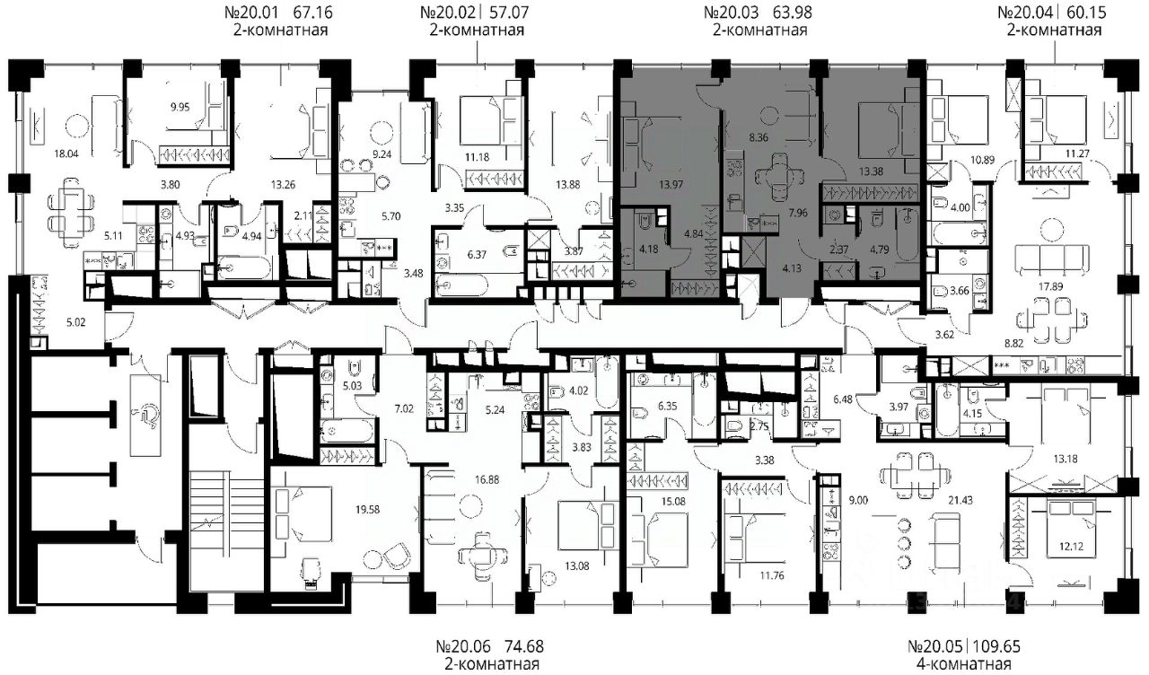 Продаётся 2-комнатная квартира общей площадью 63.98 м² с предчистовой отделкой в ЖК Сити Бэй, квартале Норс, на 20-м этаже 27 этажного дома.
