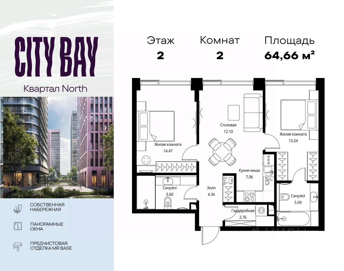 Продаётся 2-комнатная квартира общей площадью 64.66 м² с предчистовой отделкой в ЖК City Вау, квартале North, на 2-м этаже 10 этажного дома.