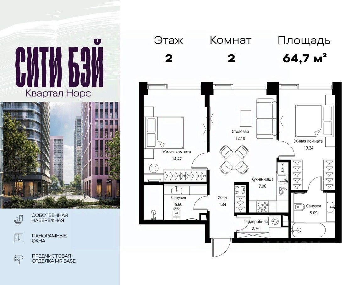 Продаётся 2-комнатная квартира общей площадью 64.66 м² с предчистовой отделкой в ЖК Сити Бэй, квартале Норс, на 2-м этаже 10 этажного дома.