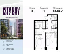 Продаётся 1-комнатная квартира общей площадью 50.78 м² с предчистовой отделкой в ЖК City Вау, квартале North, на 2-м этаже 10 этажного дома.