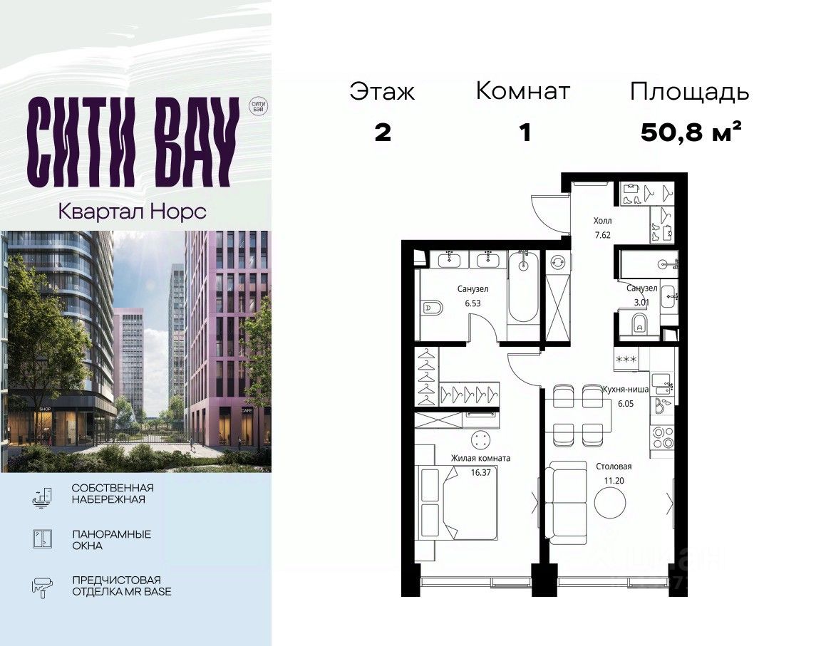 Продаётся 1-комнатная квартира общей площадью 50.78 м² с предчистовой отделкой в ЖК Сити Бэй, квартале Норс, на 2-м этаже 10 этажного дома.
