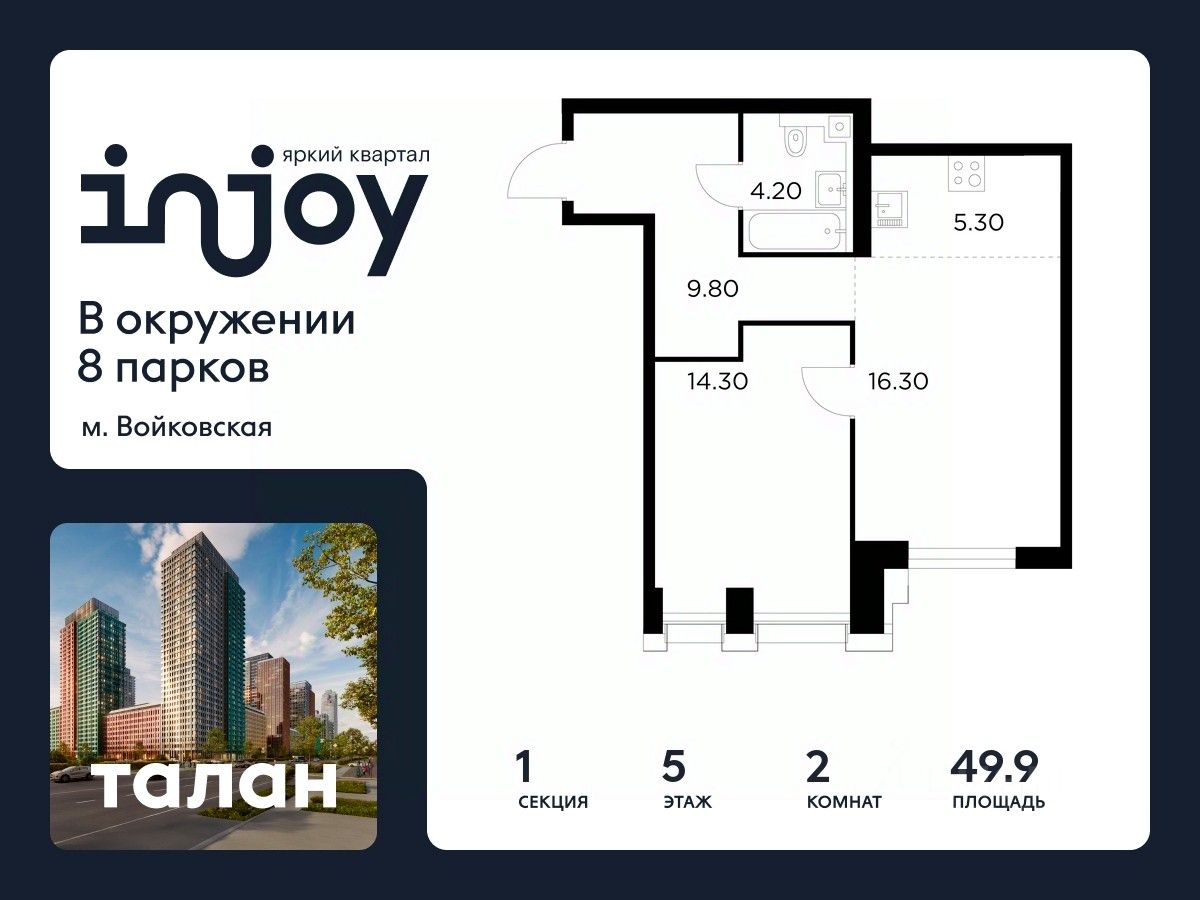 Прямая продажа от застройщика. В жилом квартале, расположенном в Войковском районе Москвы, продаётся 2-комнатная квартира площадью 49.9 кв.м без отделки. Квартира расположена на 5 этаже 35-этажного дома, корпус 1, в жилом квартале бизнес-класса INJOY.