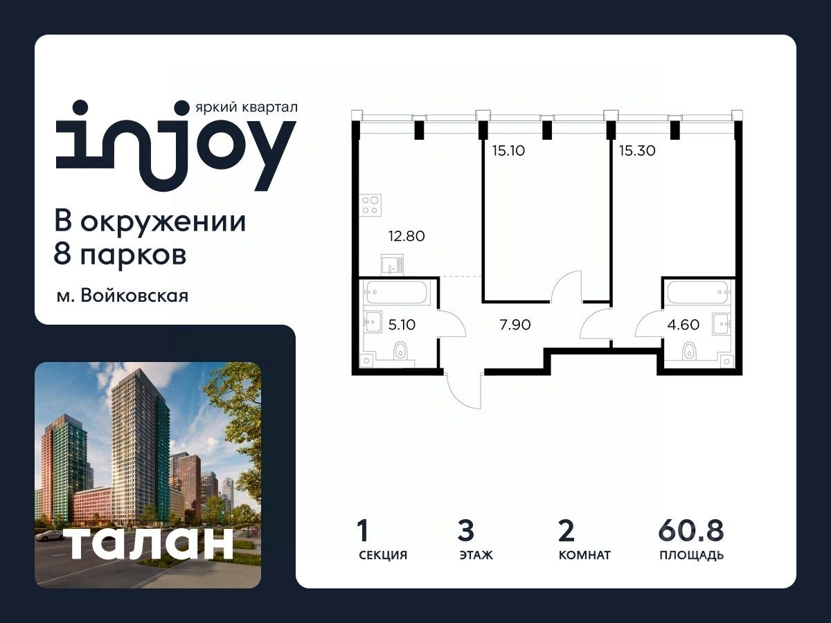Прямая продажа от застройщика. В жилом квартале, расположенном в Войковском районе Москвы, продаётся 2-комнатная квартира площадью 60.8 кв.м без отделки. Квартира расположена на 3 этаже 35-этажного дома, корпус 1, в жилом квартале бизнес-класса INJOY.