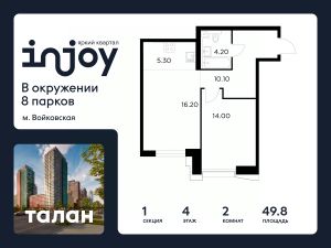 Прямая продажа от застройщика. В жилом квартале, расположенном в Войковском районе Москвы, продаётся 2-комнатная квартира площадью 49.8 кв.м без отделки. Квартира расположена на 4 этаже 35-этажного дома, корпус 1, в жилом квартале бизнес-класса INJOY.