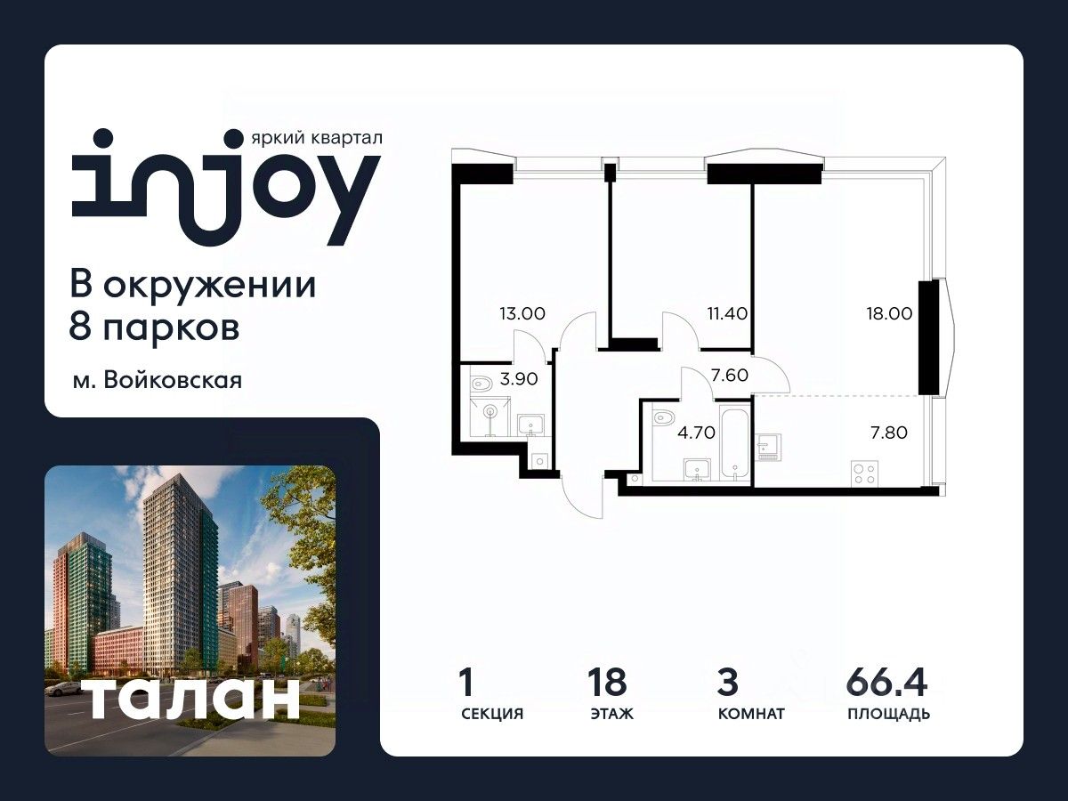 Прямая продажа от застройщика. В жилом квартале, расположенном в Войковском районе Москвы, продаётся 3-комнатная квартира площадью 66.4 кв.м без отделки. Квартира расположена на 18 этаже 35-этажного дома, корпус 1, в жилом квартале бизнес-класса INJOY.