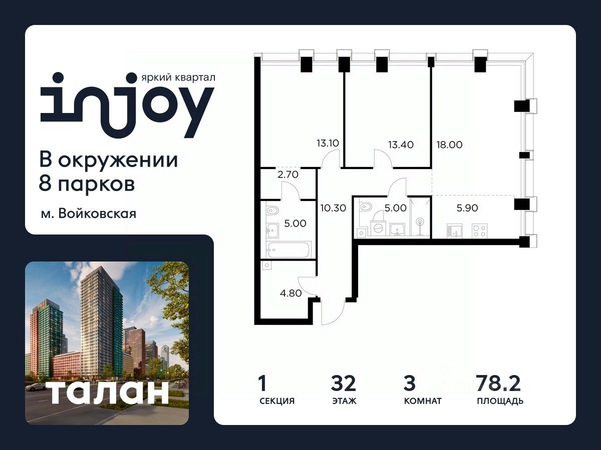 Прямая продажа от застройщика. В жилом квартале, расположенном в Войковском районе Москвы, продаётся 3-комнатная квартира площадью 78.2 кв.м без отделки. Квартира расположена на 32 этаже 35-этажного дома, корпус 1, в жилом квартале бизнес-класса INJOY.