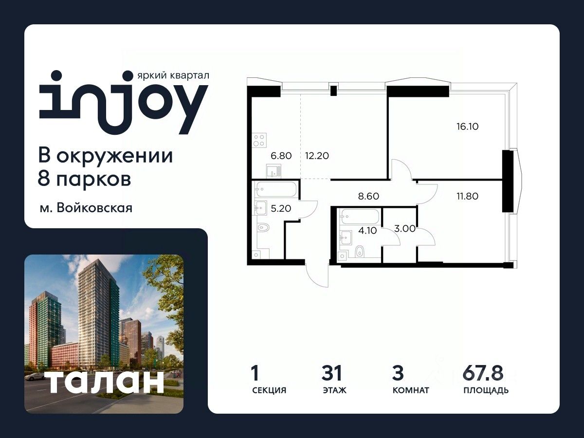 Прямая продажа от застройщика. В жилом квартале, расположенном в Войковском районе Москвы, продаётся 3-комнатная квартира площадью 67.8 кв.м без отделки. Квартира расположена на 31 этаже 35-этажного дома, корпус 1, в жилом квартале бизнес-класса INJOY.