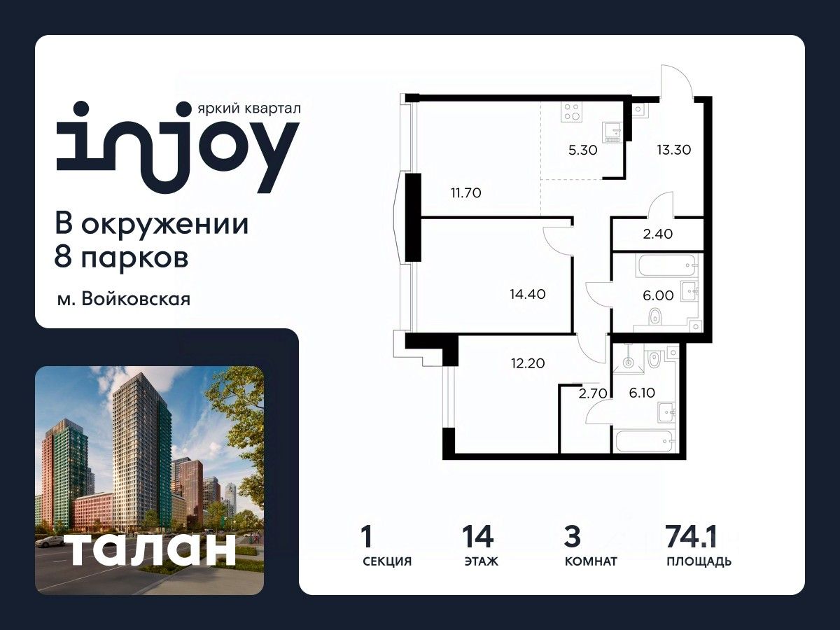 Прямая продажа от застройщика. В жилом квартале, расположенном в Войковском районе Москвы, продаётся 3-комнатная квартира площадью 74.1 кв.м без отделки. Квартира расположена на 14 этаже 35-этажного дома, корпус 1, в жилом квартале бизнес-класса INJOY.