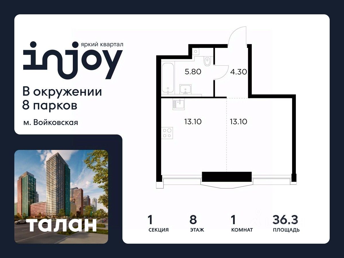 Прямая продажа от застройщика. В жилом квартале, расположенном в Войковском районе Москвы, продаётся 1-комнатная квартира площадью 36.3 кв.м без отделки. Квартира расположена на 8 этаже 35-этажного дома, корпус 1, в жилом квартале бизнес-класса INJOY.