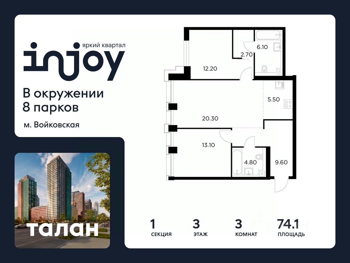 Прямая продажа от застройщика. В жилом квартале, расположенном в Войковском районе Москвы, продаётся 3-комнатная квартира площадью 74.1 кв.м без отделки. Квартира расположена на 3 этаже 35-этажного дома, корпус 1, в жилом квартале бизнес-класса INJOY.