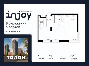 Прямая продажа от застройщика. В жилом квартале, расположенном в Войковском районе Москвы, продаётся 3-комнатная квартира площадью 66 кв.м без отделки. Квартира расположена на 13 этаже 35-этажного дома, корпус 1, в жилом квартале бизнес-класса INJOY.