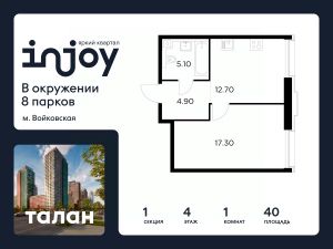 Прямая продажа от застройщика. В жилом квартале, расположенном в Войковском районе Москвы, продаётся 1-комнатная квартира площадью 40 кв.м без отделки. Квартира расположена на 4 этаже 35-этажного дома, корпус 1, в жилом квартале бизнес-класса INJOY.