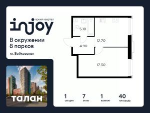 Прямая продажа от застройщика. В жилом квартале, расположенном в Войковском районе Москвы, продаётся 1-комнатная квартира площадью 40 кв.м без отделки. Квартира расположена на 7 этаже 35-этажного дома, корпус 1, в жилом квартале бизнес-класса INJOY.