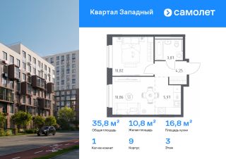 Предлагается 1-комнатная квартира комфорт-класса 35,77 кв.м в корпусе 9 на 3 этаже, в ЖК "Квартал Западный"