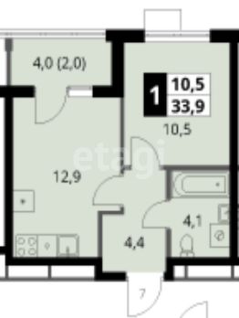 Большая кухня - 12.6 м2, жилая комната -10,5 м2, лоджия