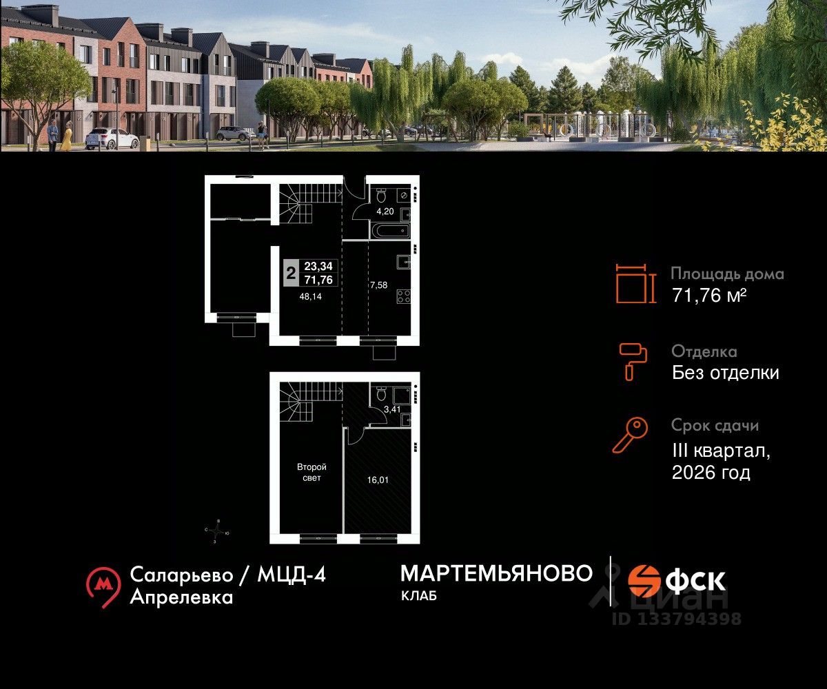 "Мартемьяново Клаб" - клубный поселок таунхаусов от ФСК в Наро-Фоминском городском округе. Счастливая жизнь складывается из плюсов двух миров: городского и загородного. Вы наслаждаетесь свежим воздухом, лесными пейзажами вокруг и отдыхом у собственного пруда. При этом пользуетесь комфортной инфраструктурой, всеми центральными коммуникациями, собственной современной школой и детским садом. Закрытая охраняемая территория дарит вам чувство спокойствия и безопасности. А заказать все услуги возможно через мобильное приложение управляющей компании. Выбираться во внешний мир легко благодаря хорошей транспортной доступности.
