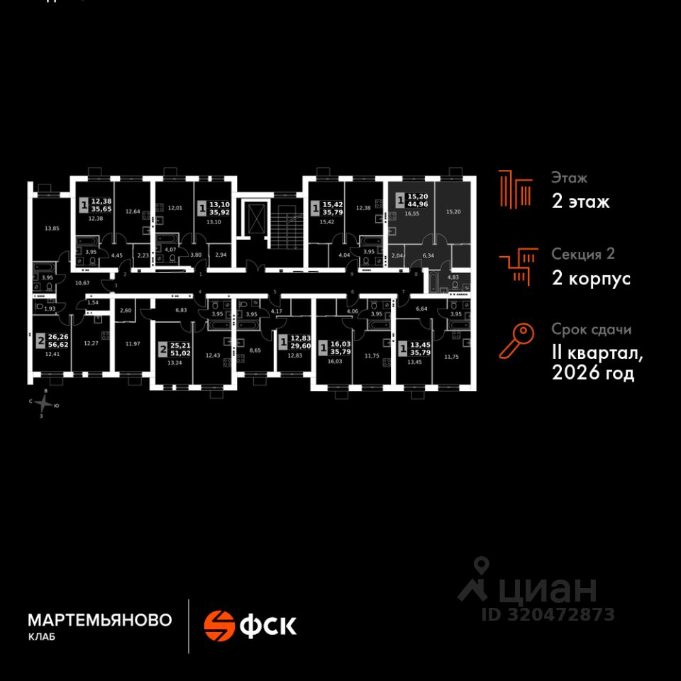 Продаётся 1-к квартира номер 37 общей площадью 44.96 кв.м на 2-м этаже 3 этажного дома. Без отделки.