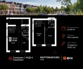 Продаётся 1-к квартира 43 общей площадью 64.89 кв.м на 3-м этаже 3 этажного дома. Без отделки.