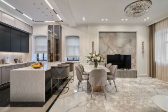 Апартаменты с двумя спальнями в клубном доме премиум-класса il Ricco на Чистых прудах. Апартаменты площадью 126 м² расположены на третьем этаже, выполнена дизайнерская отделка в современном стиле. Интерьеры наполнены мебелью и бытовой техникой. Спланирована кухня-гостиная, мастер-спальня с собственной ванной и гардеробной, вторая спальня, санузел, прихожая. Из окон открываются виды на две стороны света — на улицу и во двор.