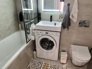 Санузел отделан керамогранитом , пластиковые окна все заменены (тонированные с повышенным теплосбережением), инженерка и электрика была переделана после застройщика на дорогую и качественную.