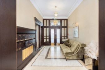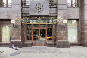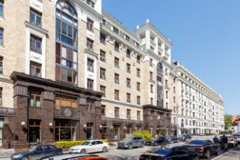 Дом премиум-класса, 300 квартир. Сочетание стиля роскошных особняков 19 века и сталинского ампира. Фасады из природного камня с колоннадами, лепниной, панно из итальянской мозаики с гербом Grand Deluxe. Лифты Schindler.