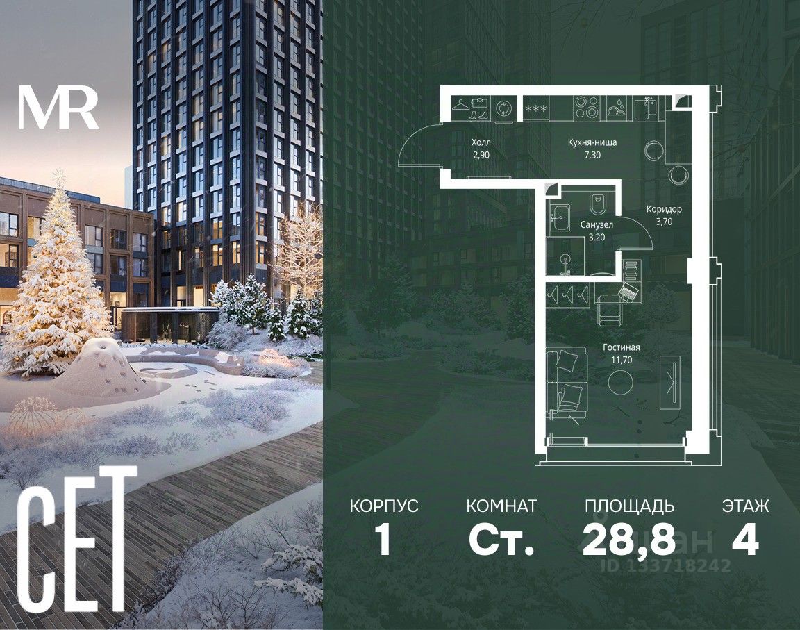 В ЖК Сет продается студия площадью 28.80 м², расположенная в корпусе 1, на 4 этаже 18 этажного дома.