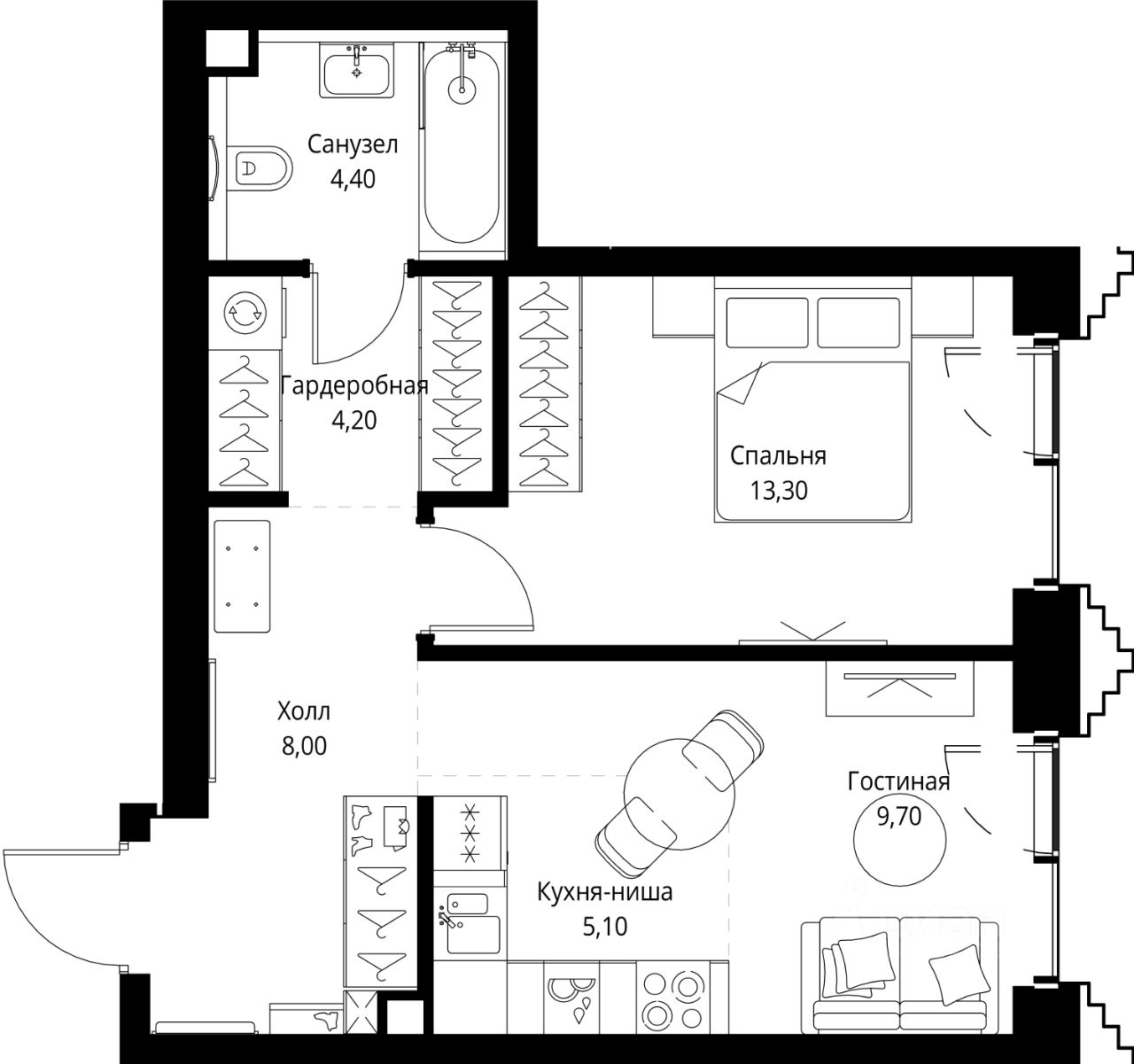 В ЖК SET продается 1-комнатная квартира площадью 44.70 м², расположенная в корпусе 2, на 5 этаже 59 этажного дома.