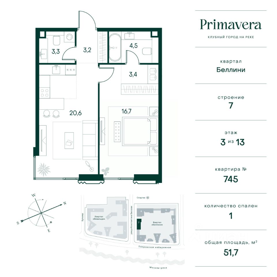 Клубный город на реке Primavera — это респектабельный проект премиум-класса на первой береговой линии Москвы-реки в экологически безупречном районе — Покровское-Стрешнево. Под панорамными окнами квартир расположился собственный экопарк, площадью 12 гектаров с сетью прогулочных дорожек, оборудованный детскими и спортивными площадками, а за ним набережная с собственным пляжем и зонами отдыха. Клубный город на реке Primavera предлагает впечатляющий выбор планировок для любого жизненного сценария: от просторных однокомнатных квартир до пентхаусов и квартир с видовыми террасами или патио. Выбирайте из 120 вариантов эргономичных планировок стандартного и евроформата. В проекте доступны квартиры площадью от 40 до 209 м², в каждой из которых открываются непревзойденные виды на реку, а угол обзора составляет 270 градусов. Из дизайнерских лобби открывается панорамный обзор на зеленый благоустроенный двор. Статусное мебелирование, потолки высотой 6 м и комфортная лаунж-зона отсылают к стилистике высококлассных пятизвездочных отелей. В Primavera есть все, что может предложить мегаполис, здесь все сосредоточено вокруг вас и настроено на ваши желания: - Всестороннее детское развитие в паре шагов от дома: 4 школы, 8 детских садов, развивающие центры с кружками и секциями. - Комфорт мегаполиса на расстоянии приятной прогулки: супермаркеты, кафе, рестораны с верандами на крыше, салоны красоты, аптеки, компании сферы услуг, многофункциональный центр для шоппинга и развлечений. - Умный дом: автоматизированное бесконтактное управление основными системами доступа, инфраструктуры и безопасности через мобильное приложение и специальные метки. Клубный город на реке Primavera выгодно отличается близостью к природе, совмещенной с насыщенной инфраструктурой.