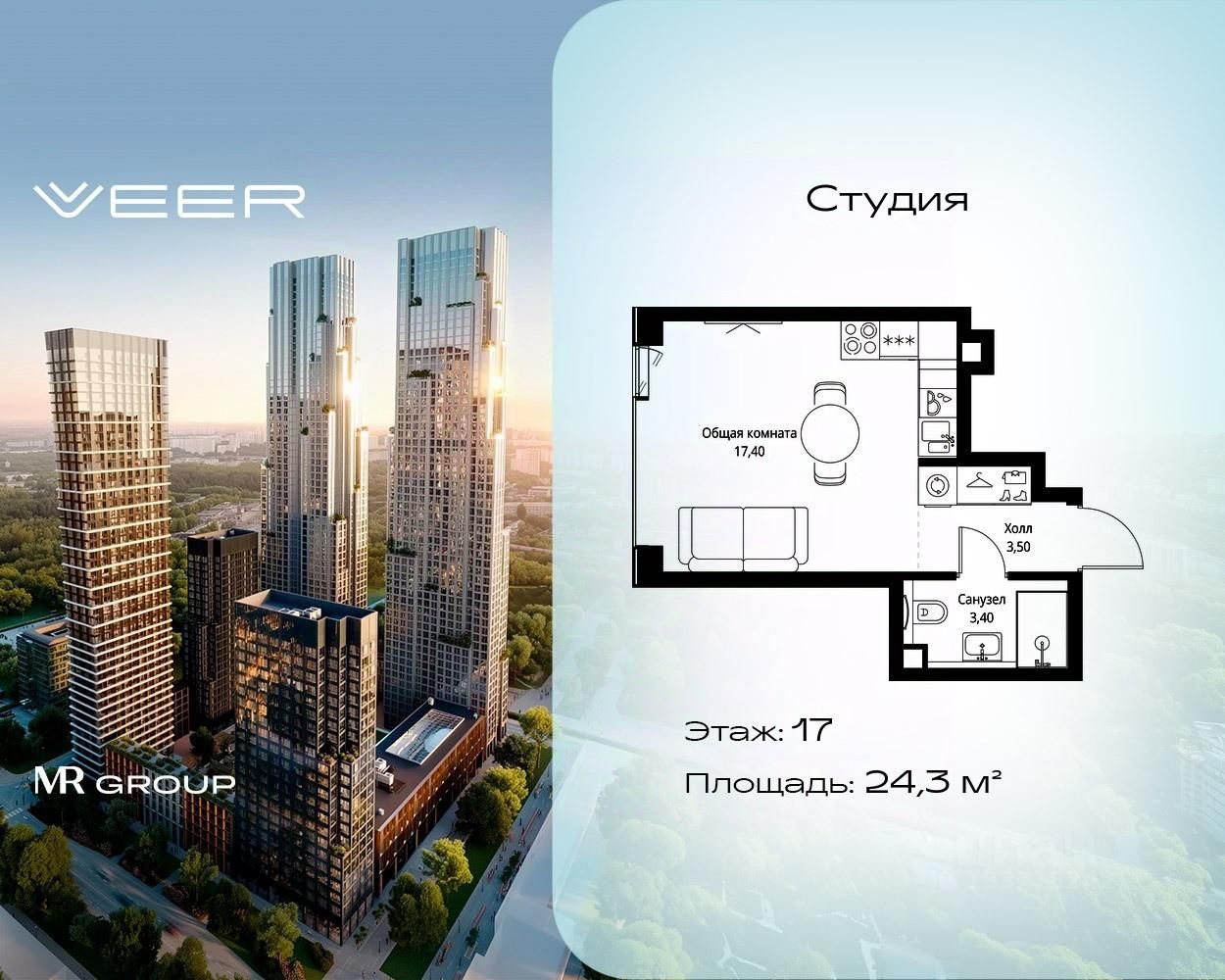 Продаётся студия общей площадью 24.30 м² с предчистовой отделкой в ЖК VEER на 17-м этаже 22 этажного дома.
