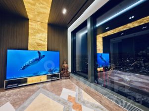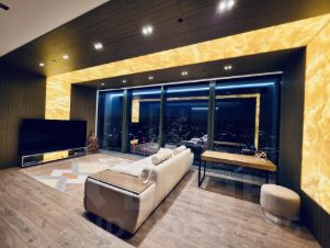 • Роскошный дизайнерский ремонт: Современный стиль с использованием премиальных материалов, включая итальянский оникс сорта Arco Iris с подсветкой, создающий завораживающую атмосферу.