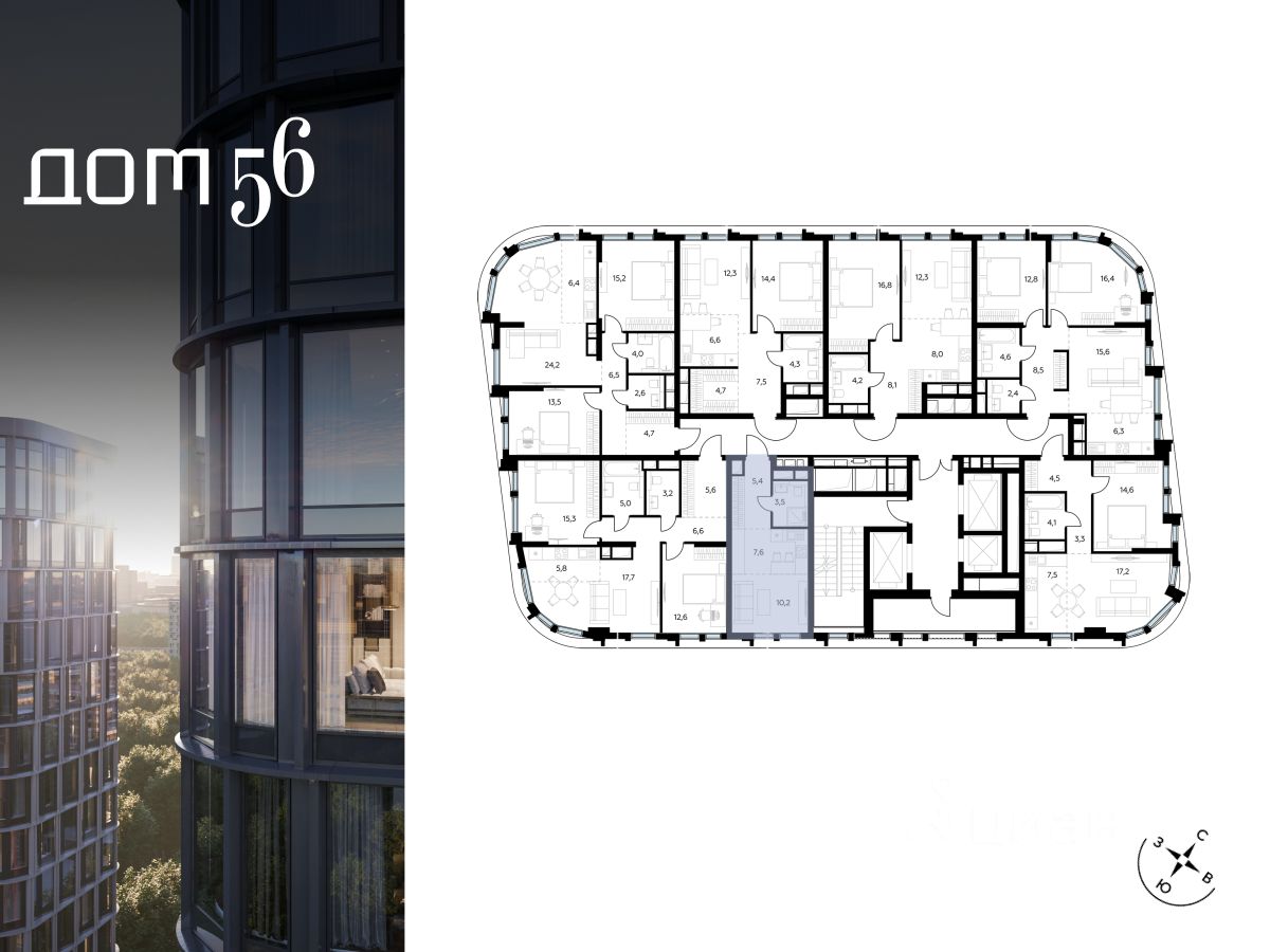 Архитектурный стиль "Дома 56" - параметрический минимализм. Футуристические фасады квартала с "эффектом закручивания" словно вращаются вокруг своей оси. Динамичный образ башен дополняет эффектное остекление - окна в пол будут в каждой квартире.