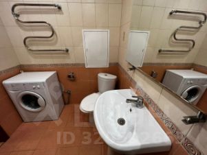 Санузел совмещённый, выполнен в плитке, ванная, есть полки для хранения, стиральная машина.