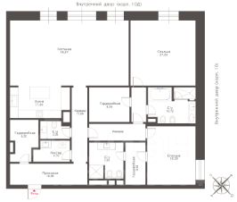 Оптимальный вариант организации пространства: гостиная-столовая, 2 спальни с ванными и гардеробными, гостевой санузел, постирочная, гардеробная.
