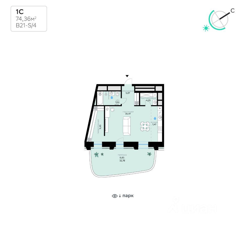 В продаже — однокомнатная квартира с чистовой отделкой, общей площадью 74,36 кв. м. Квартира расположена на первом этаже шестиэтажной секции корпуса класса Суперб в новом районе СберСити, который строит Сбер. Дом находится на первой береговой линии Москвы-реки.